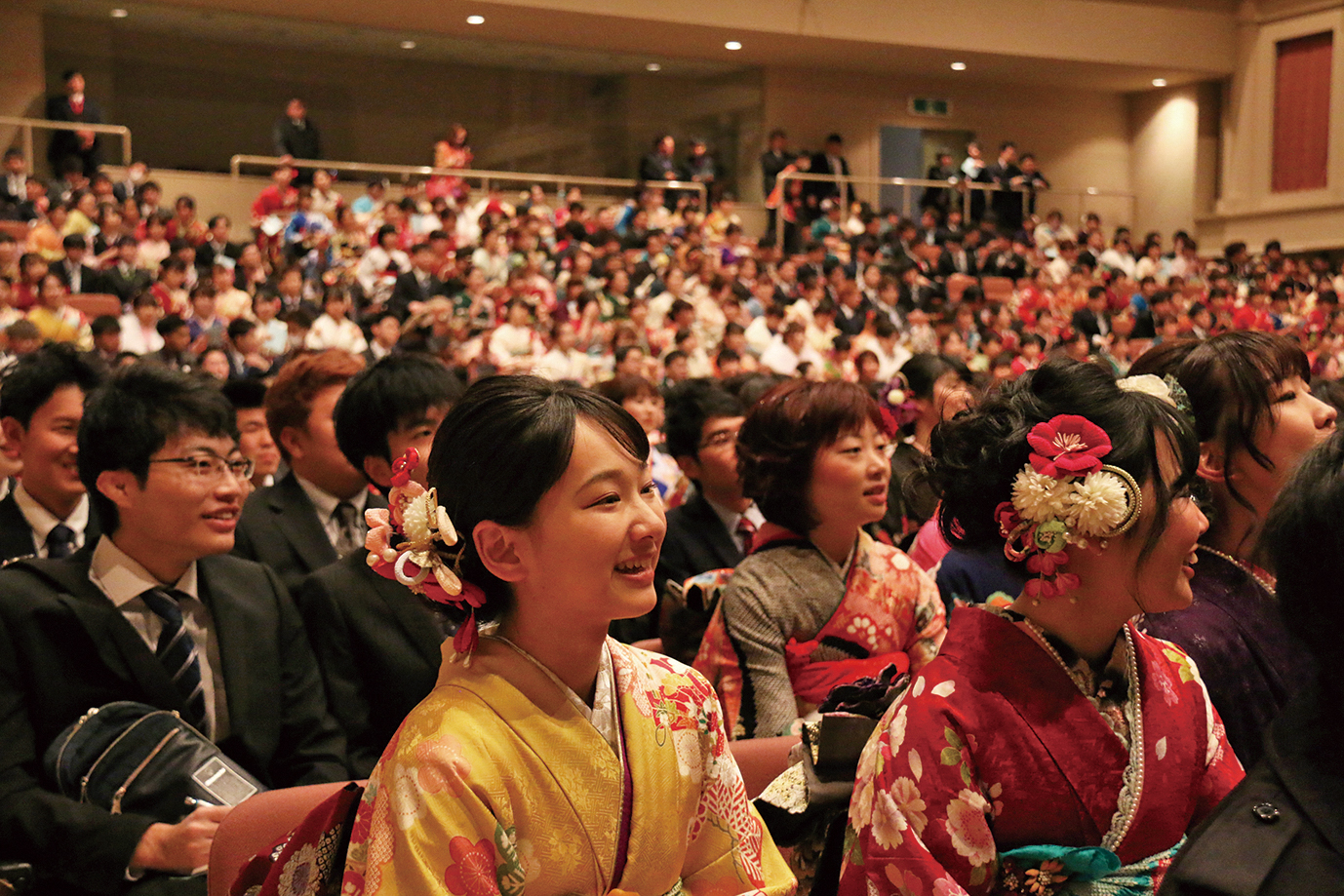 平成31年坂井市成人式が、ハートピア春江で開催され、新成人897人が出席しました。今年のテーマは「#animato(アニマート)」。「#(シャープ)」は「半音上げる」、「animato(アニマート)」は「生き生きと」を意味する音楽用語で、一歩一歩いきいきと人生の階段を上っていこうという想いが込められています。出席した新成人たちは、久しぶりに会う友人や恩師たちとの交流を楽しみました。
