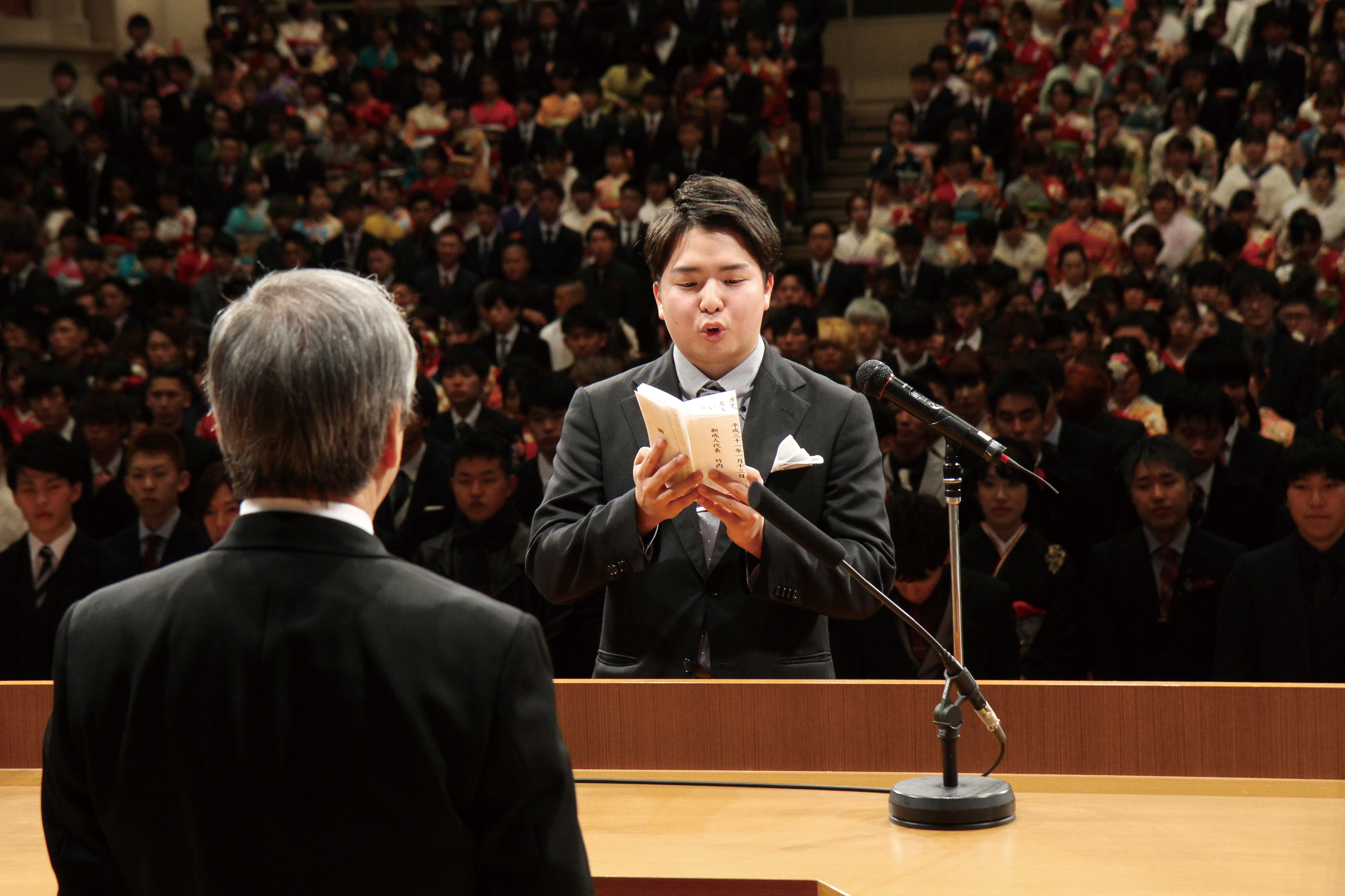 「両親や恩師、友人たちに感謝し、未来をより良く築いていく」と謝辞を述べる竹内亮人(たけうちあきと)さん