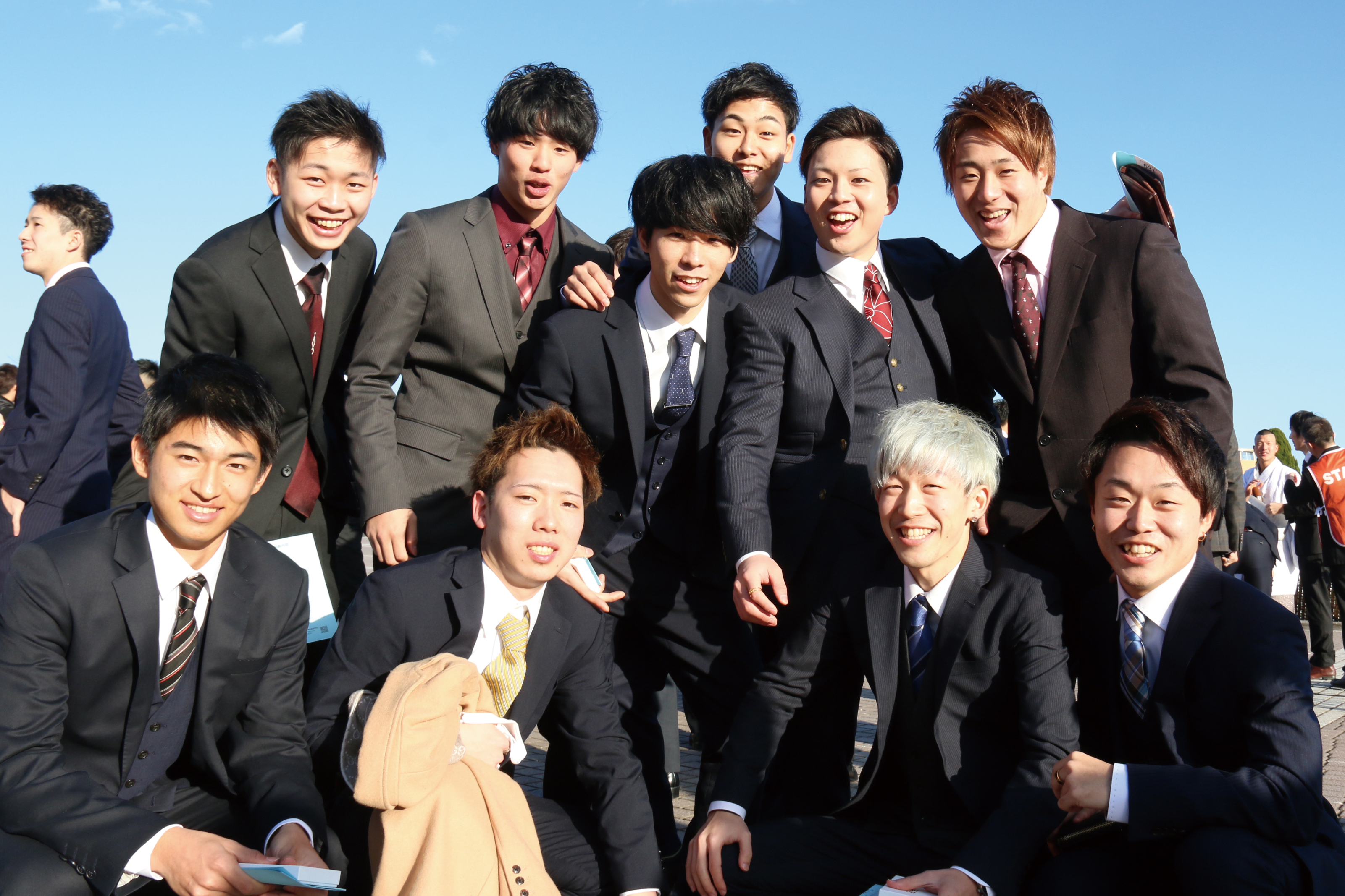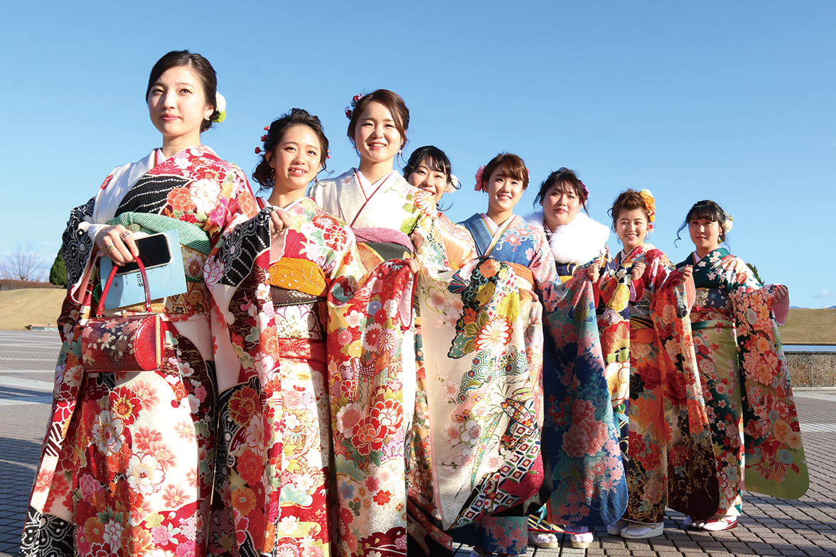晴れ渡る青空の下、友人たちと記念写真を撮る新成人たち