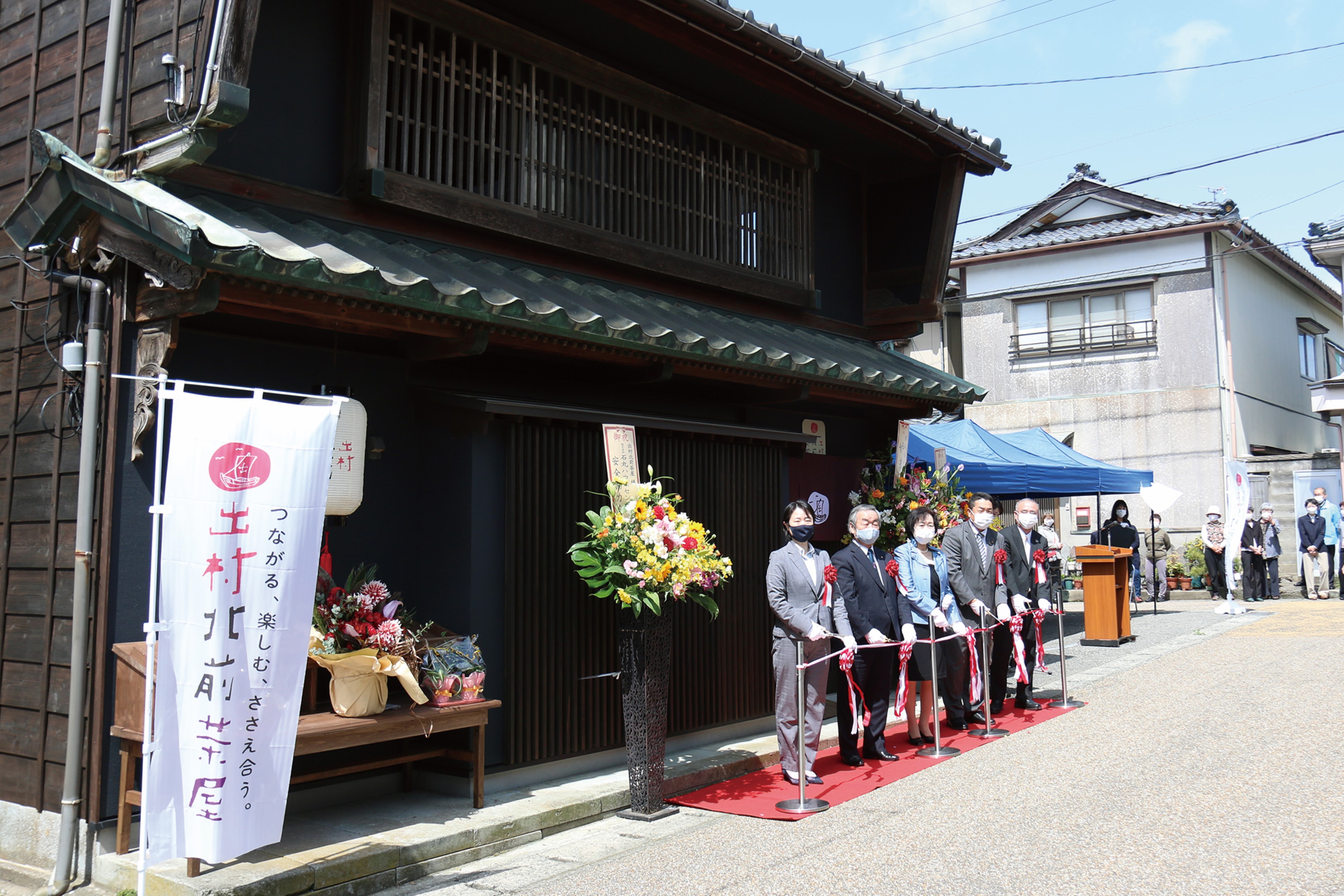 地域の交流の場となる出村北前茶屋のオープンを祝い、テープカットを行う関係者たち