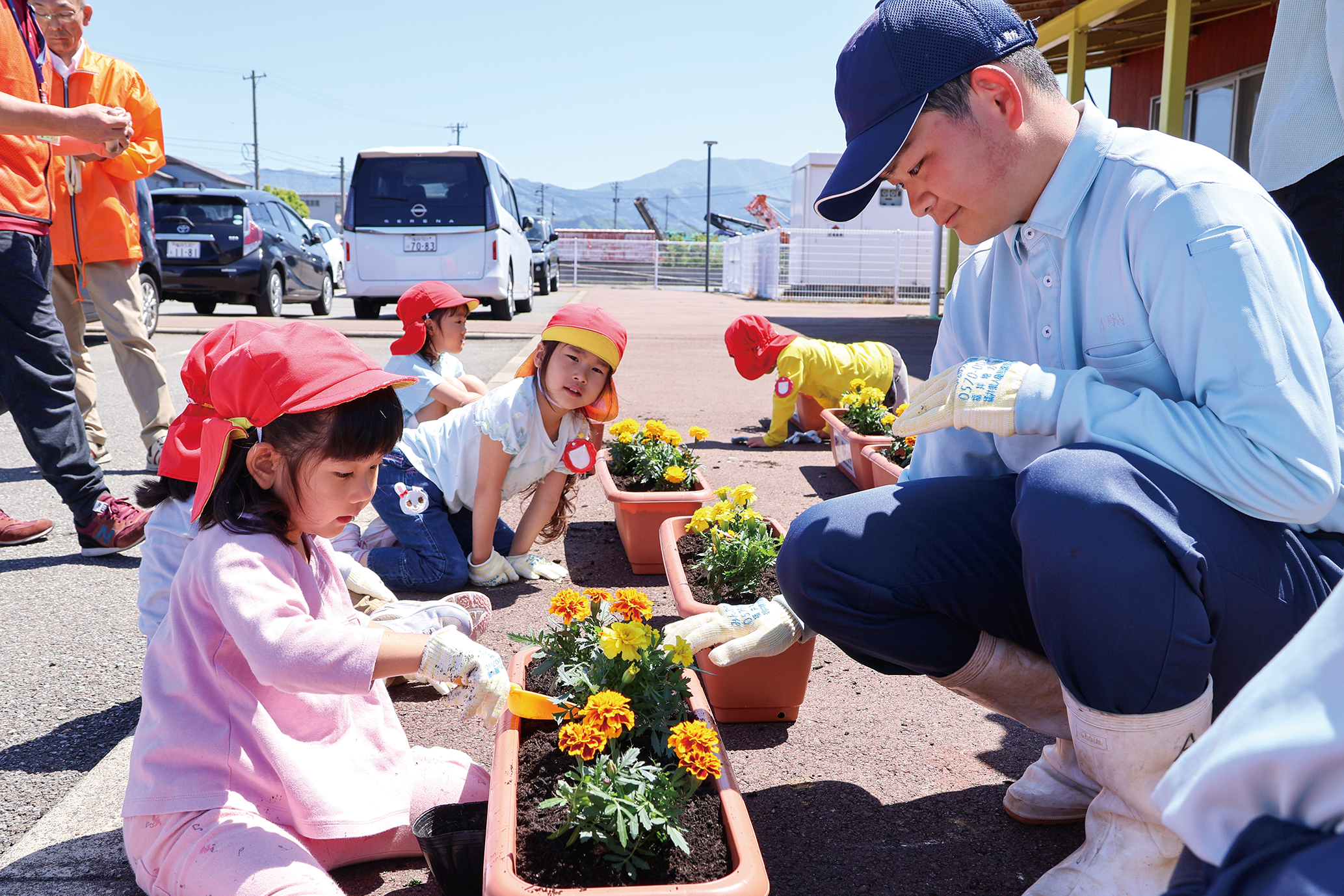 坂井こども園の5歳児19名が「人権の花運動」として、人権擁護委員や坂井高校の生徒たちと協力しながら、花の苗の移植を行いました。