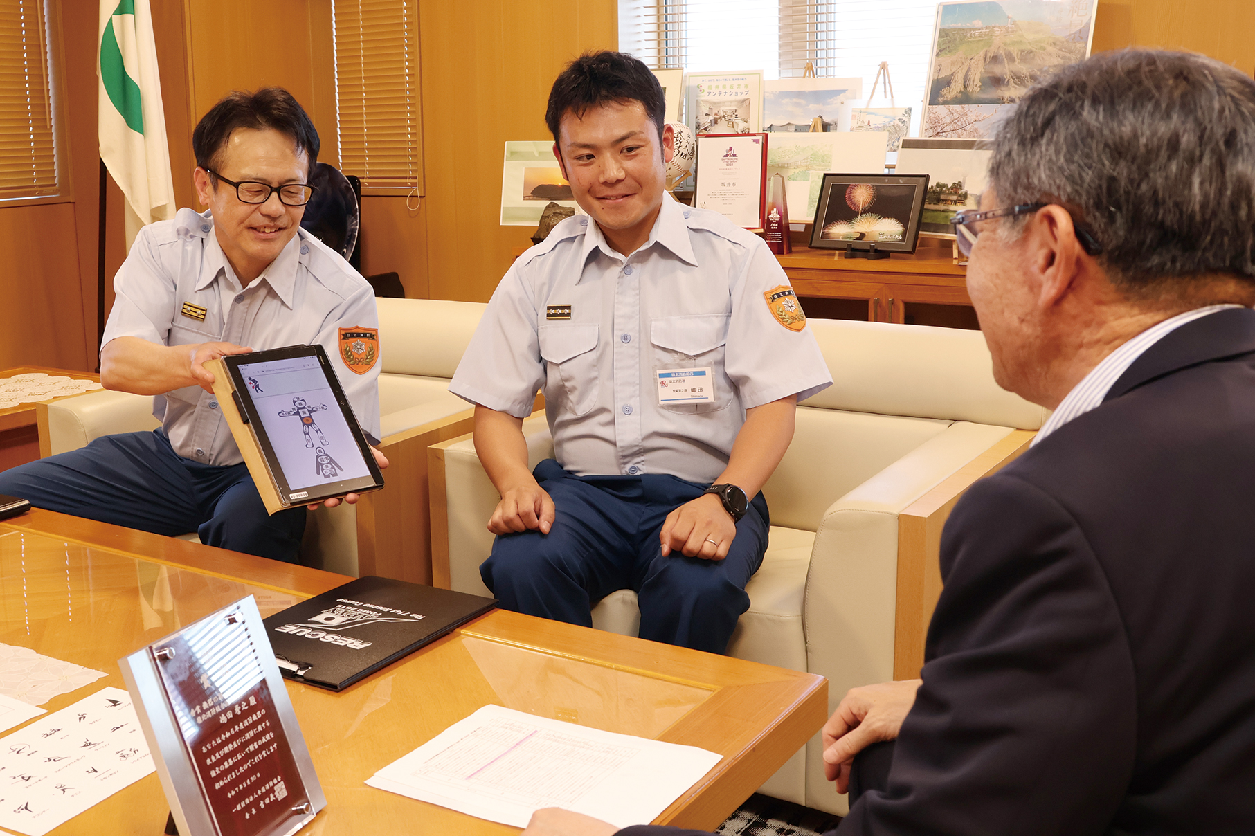 開発したツールを市長に説明する同組合の伏見卓良(ふしみたかよし)副署長(左)と嶋田誉之(しまだたかゆき)消防士長(右)