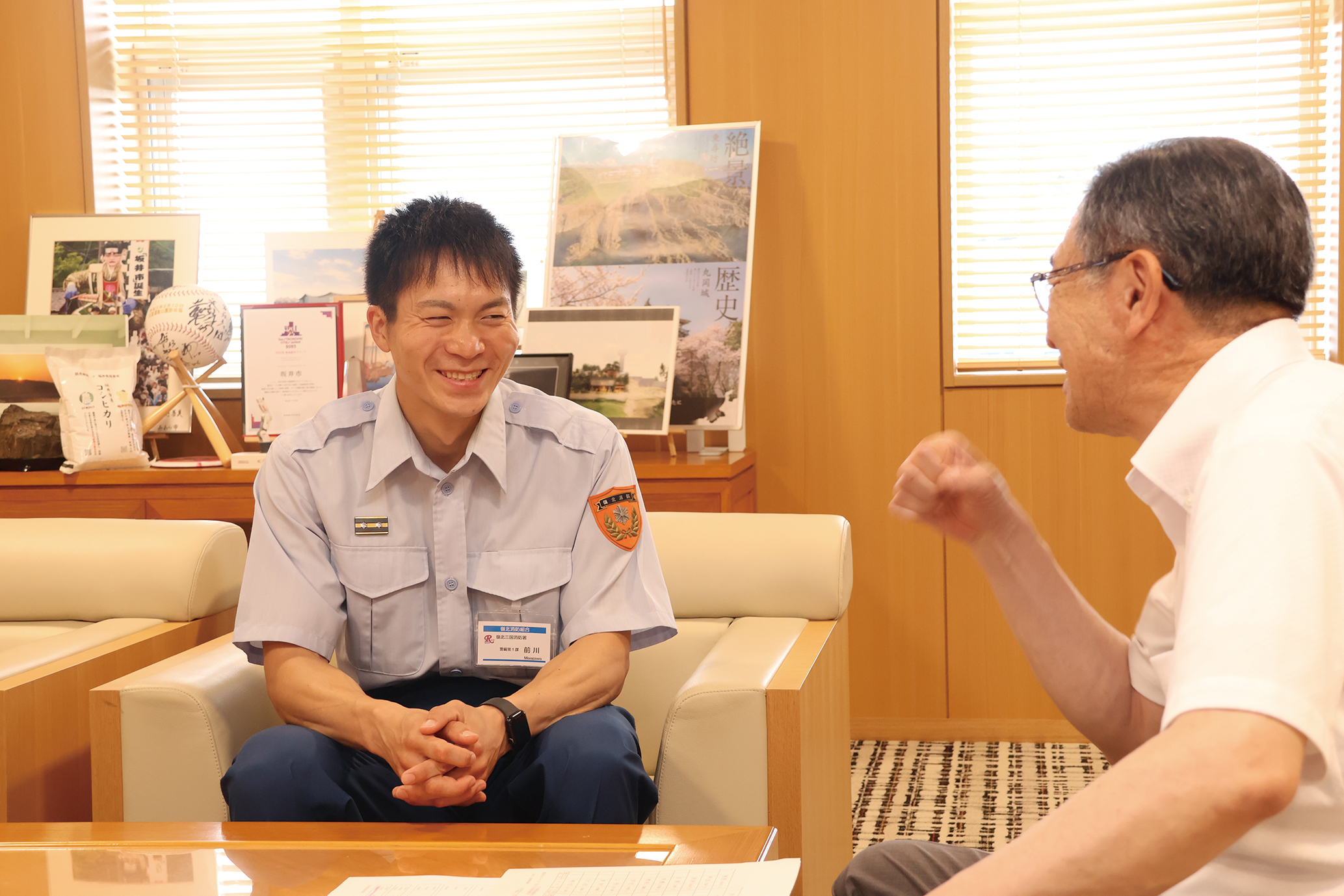 県消防救助技術大会に出場し、ロープブリッジ渡過の種目で優勝を飾った嶺北三国消防署の前川将希(まえがわまさき)さんが、池田市長に結果を報告しました。8月には全国大会に出場予定。市長は「全国大会でも、日頃の成果を充分に発揮してほしい」と激励しました。