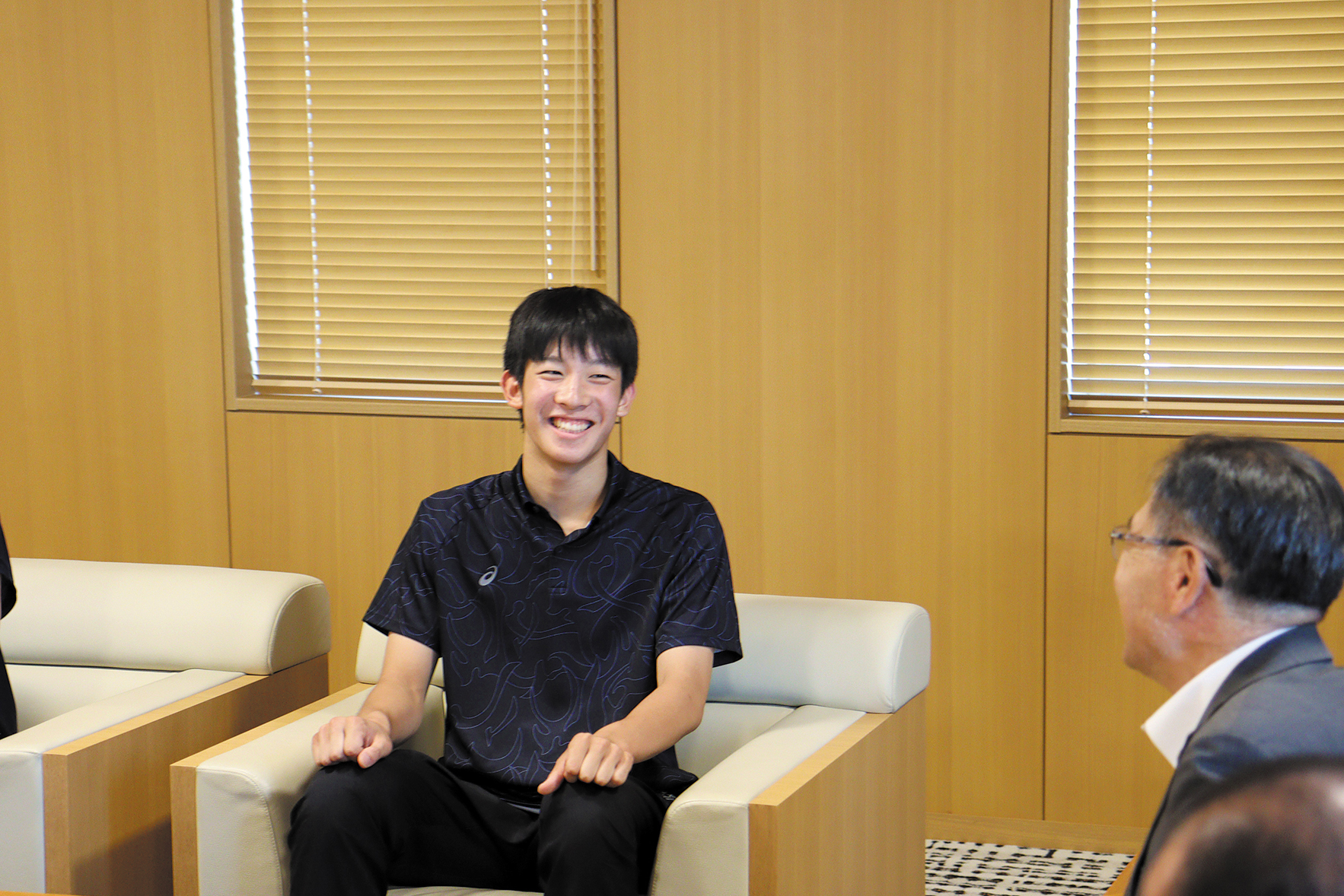 バレーボール男子U16アジア選手権に出場した手塚純矢さん(春江中学3年)が池田市長へ結果を報告しました。手塚さんは、アウトサイドヒッター(OH)として全試合に先発出場。全16チーム中、日本は4位となり、来年のU17世界選手権の出場権を獲得しました。