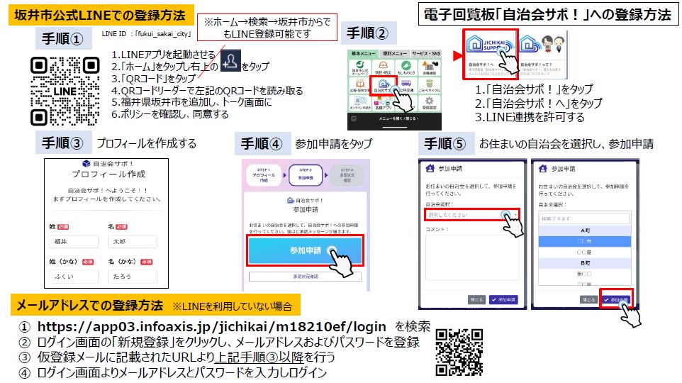 坂井市では、自治会(区・集落・町内会)内での文書の回覧や情報共有をデジタル化するサービス「自治会サポ!」の運用を順次開始しています。お手持ちのスマートフォンやタブレット、パソコンなどで内容を確認できます。お住まいの自治会で、デジタル化に取り組みたい場合はお気軽にお問い合わせください。